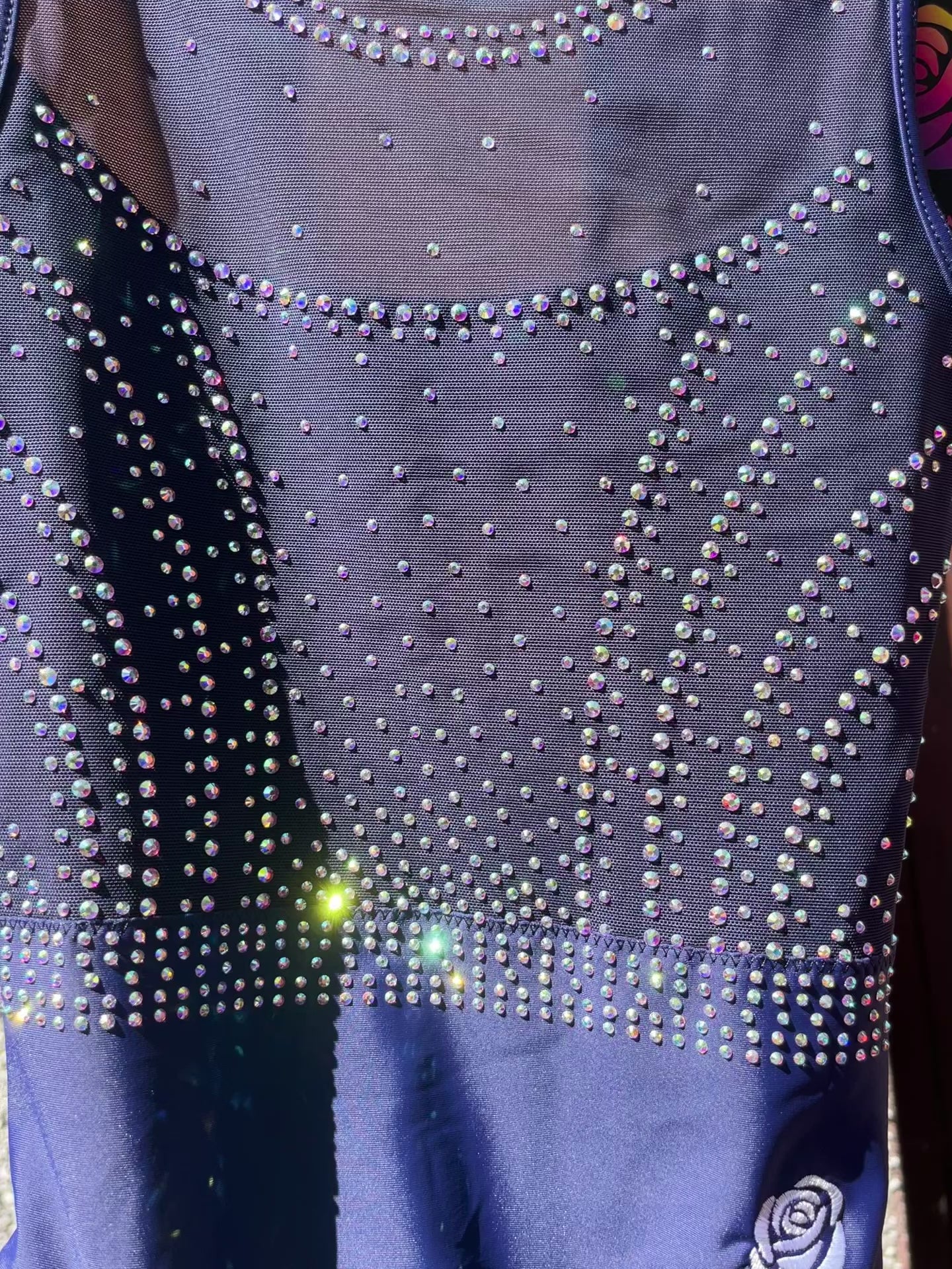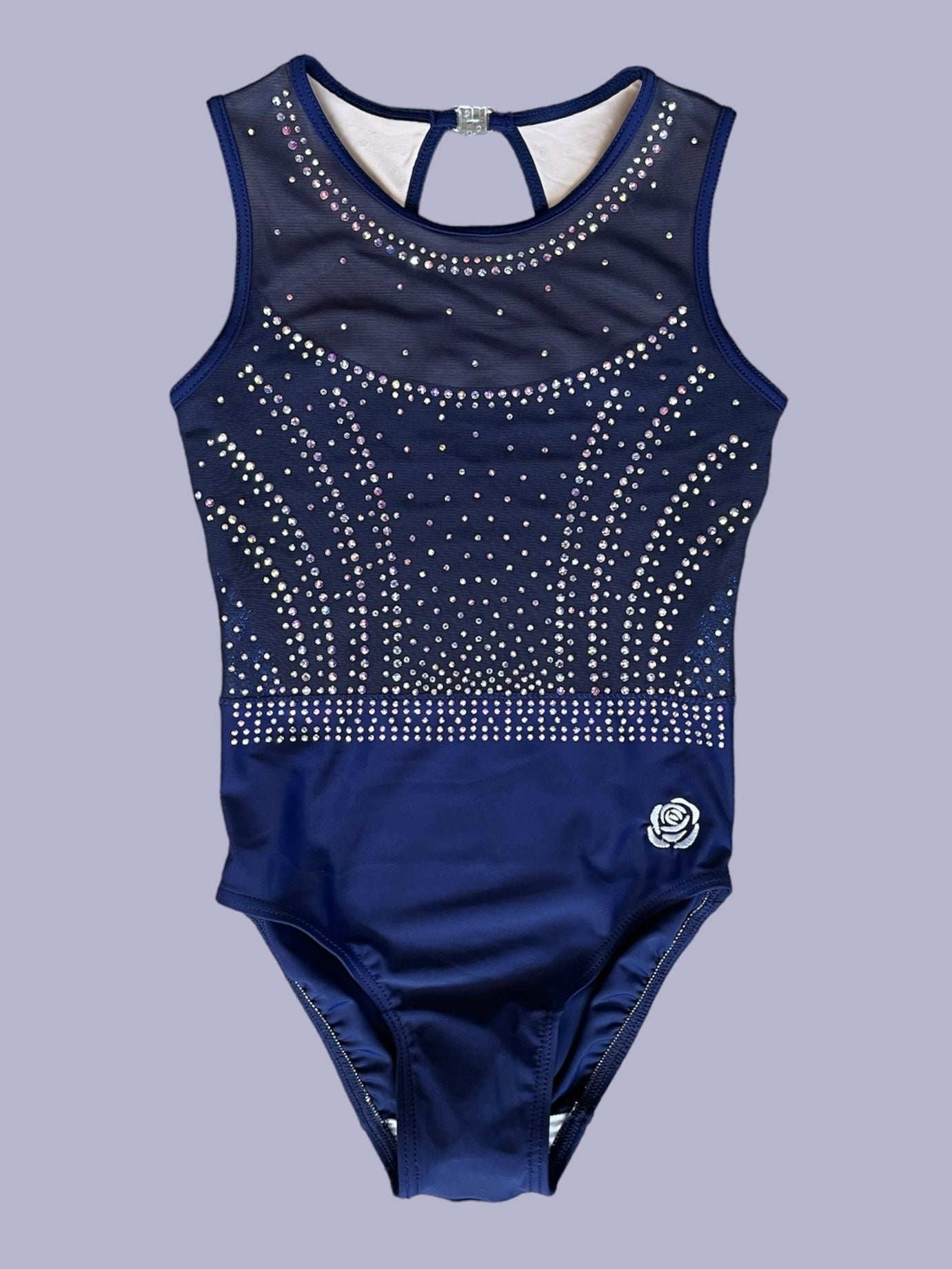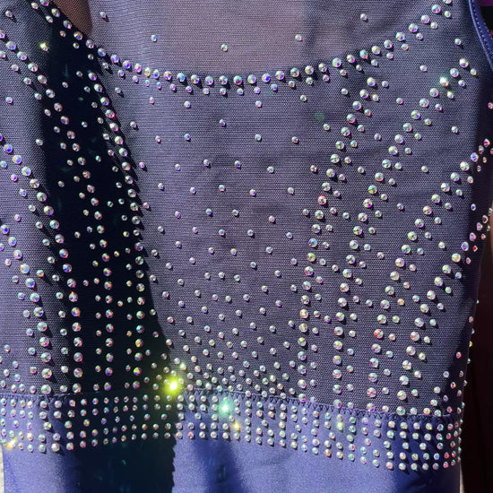 Classic design in sophisticated navy blue Lycra. Subtle mesh and mystique lining details with lots of AB sparkle. Fastened with a small clip at the back.