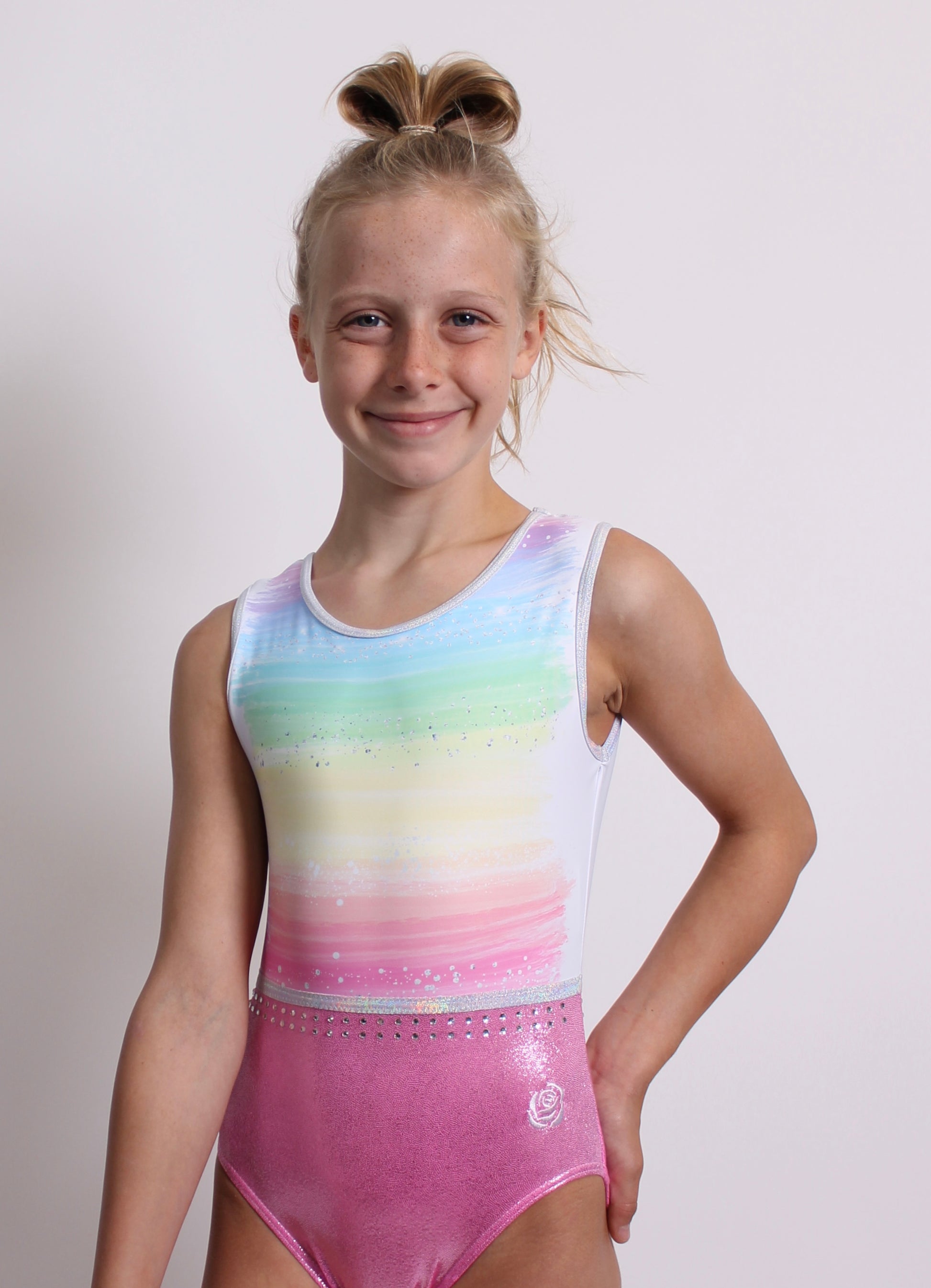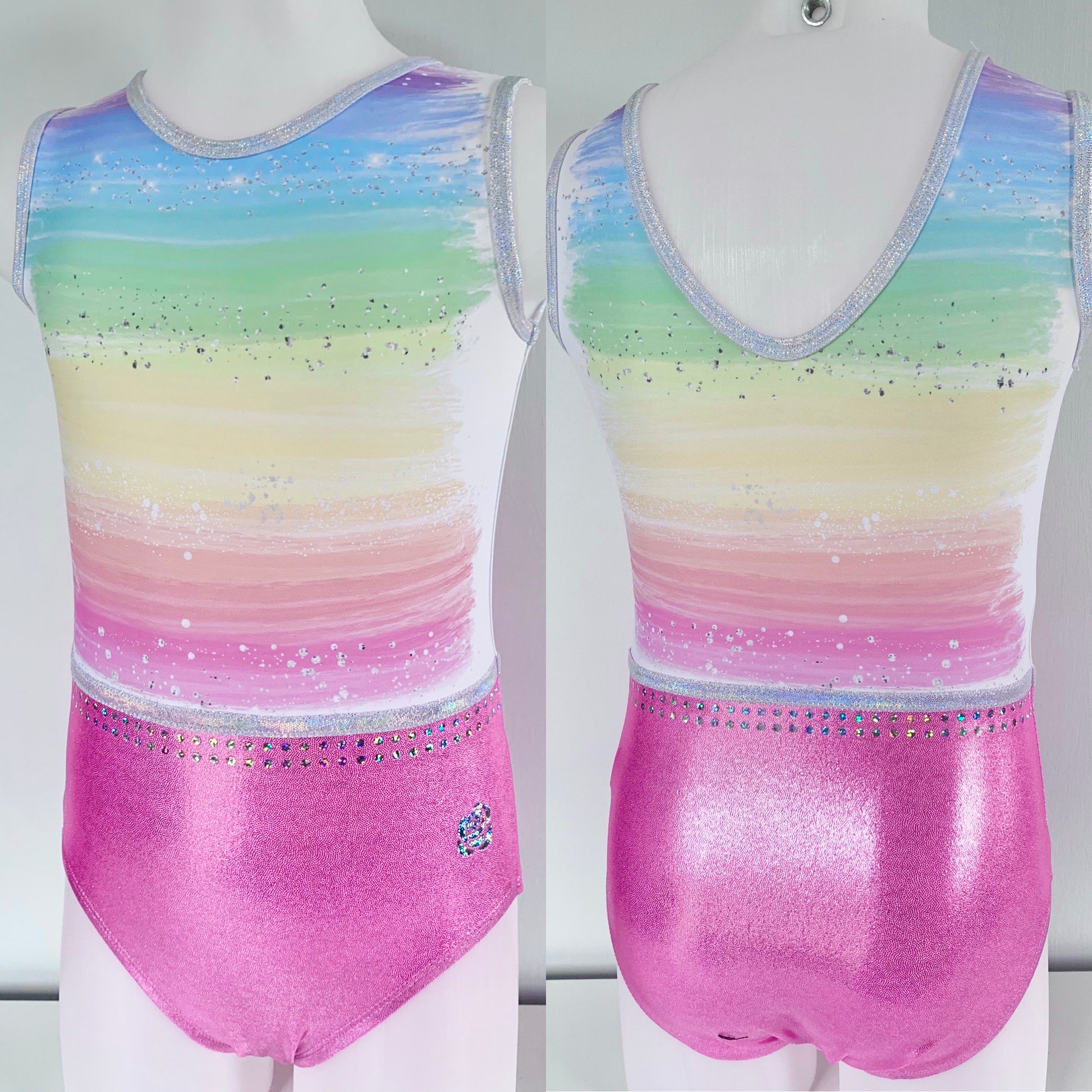 Soft and pretty printed lycra leotard with bubblegum pink mystique lower half and holographic silver mystique details.