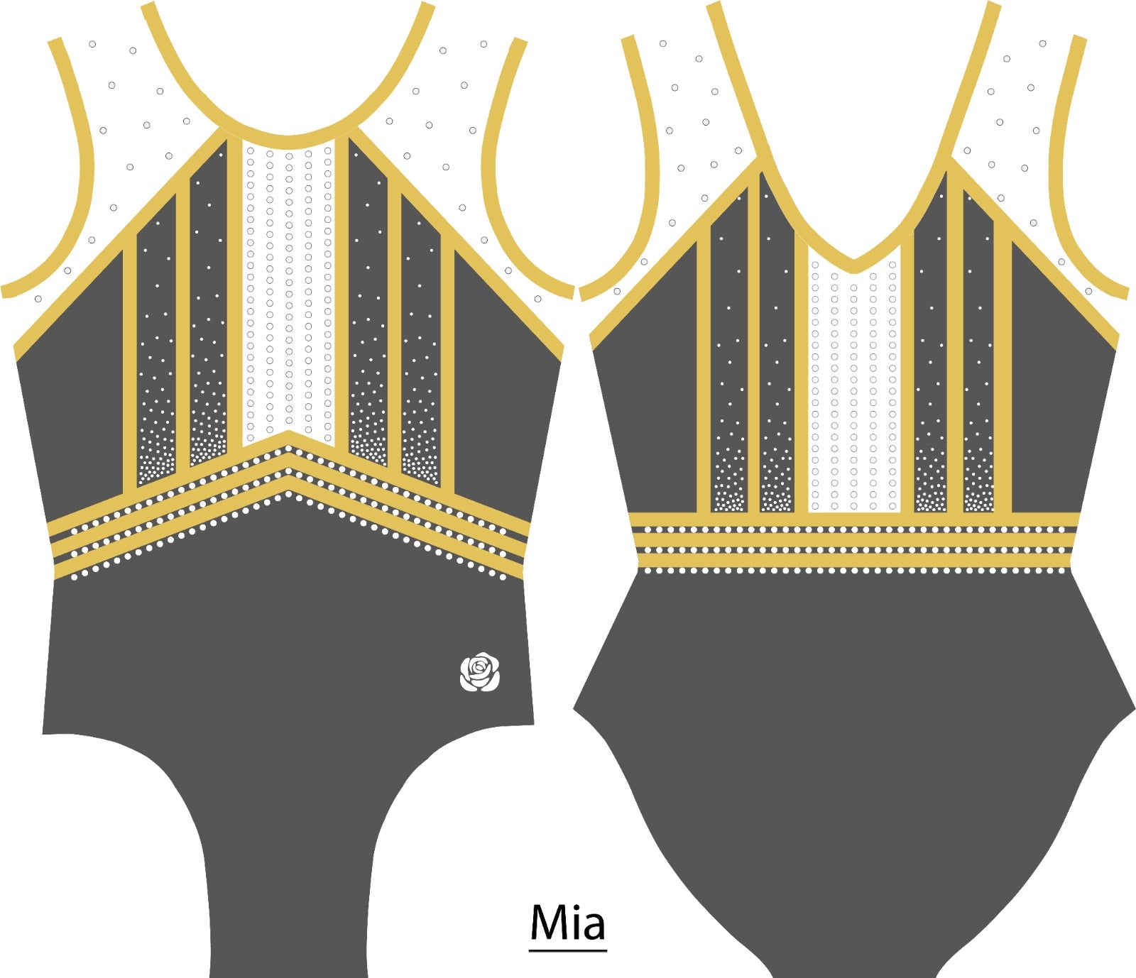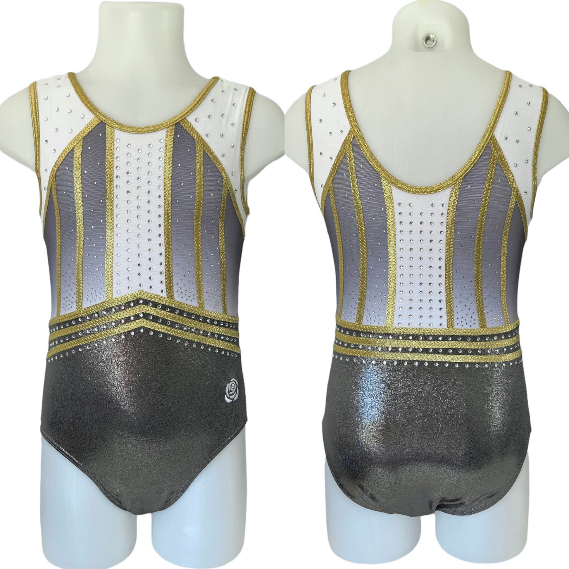 Gunmetal and white mystique short-sleeve leotard overlaid with printed mesh, gold mystique binding and appliqué details with lots of clear crystal sparkle!