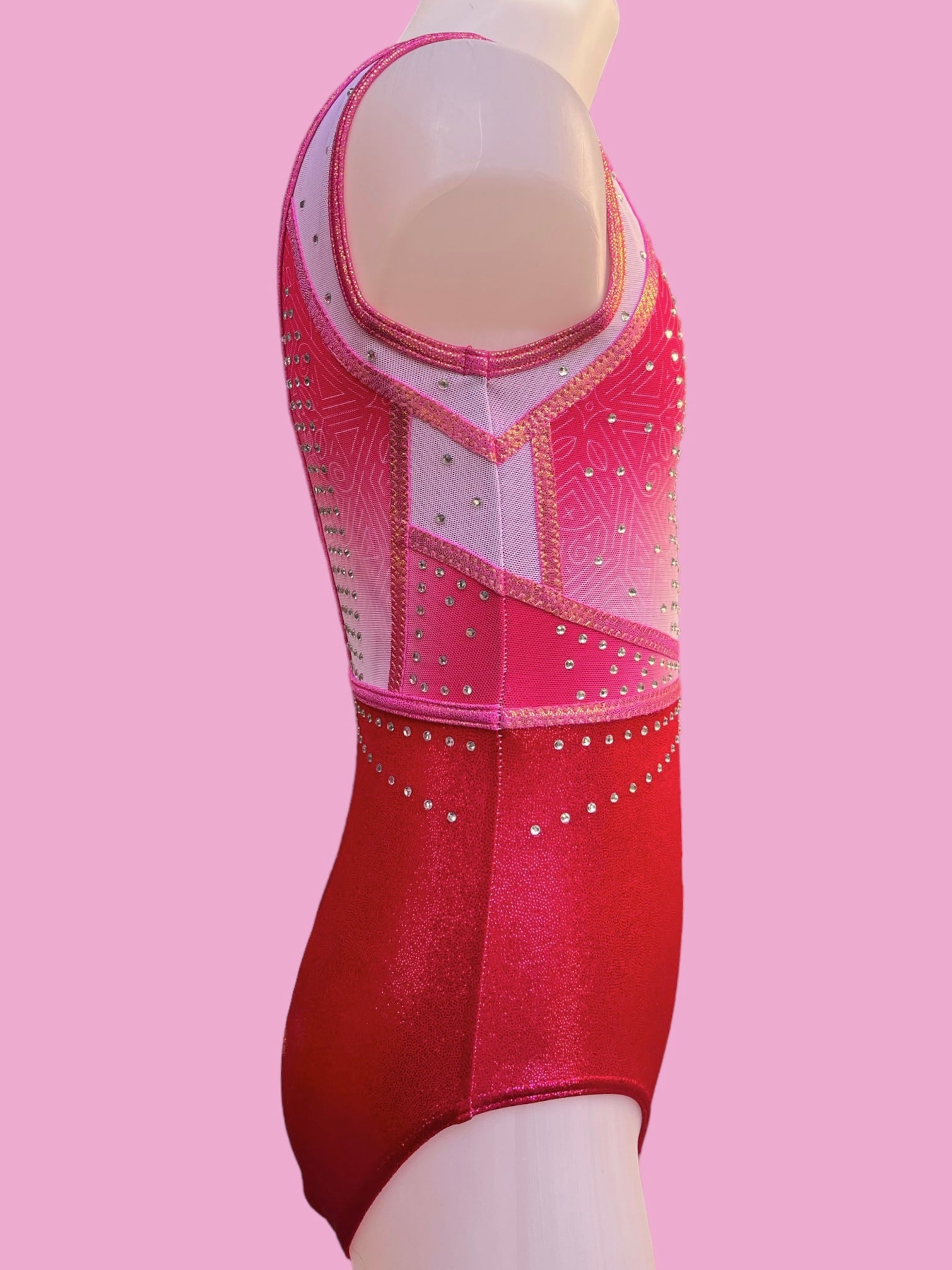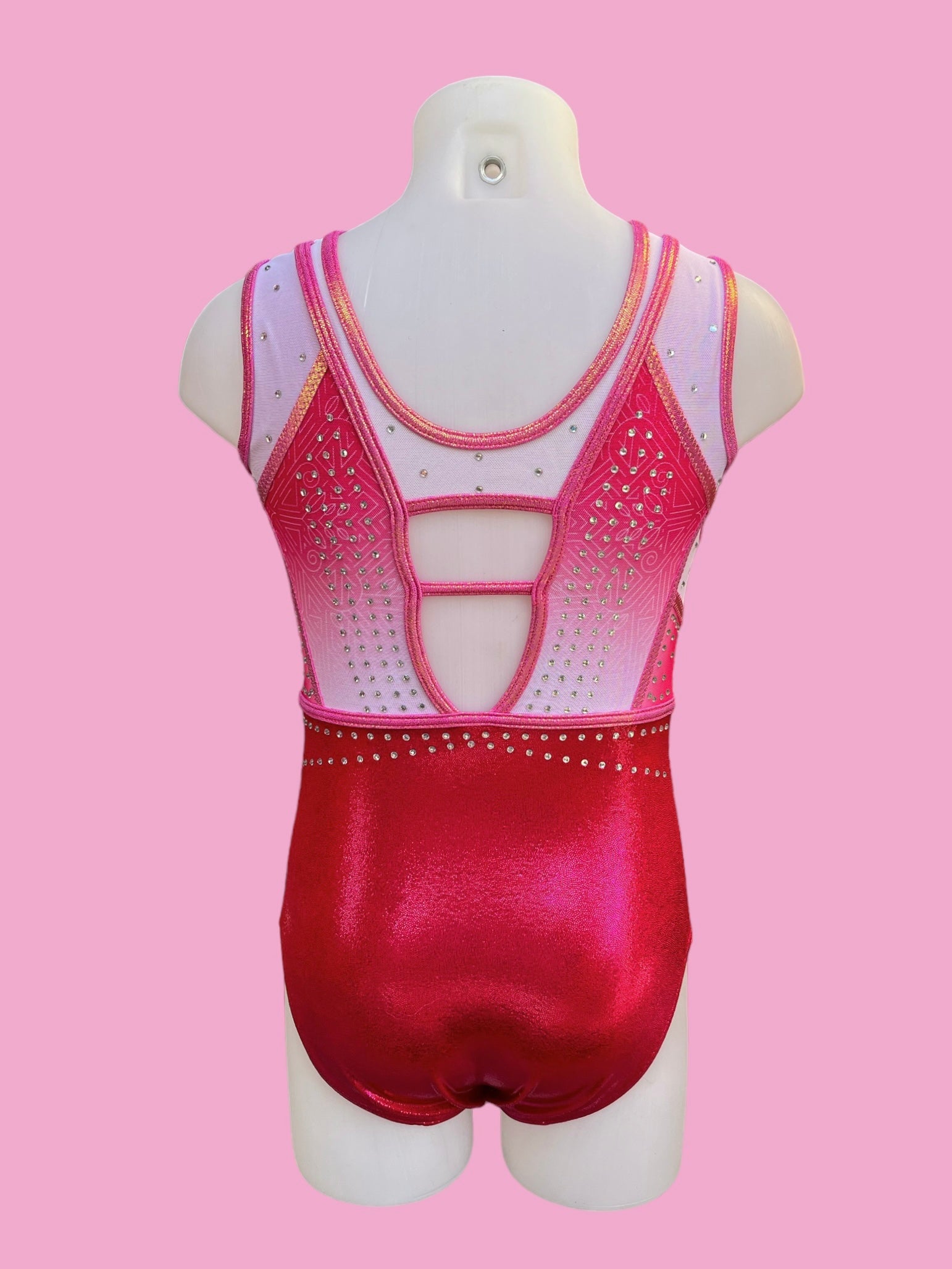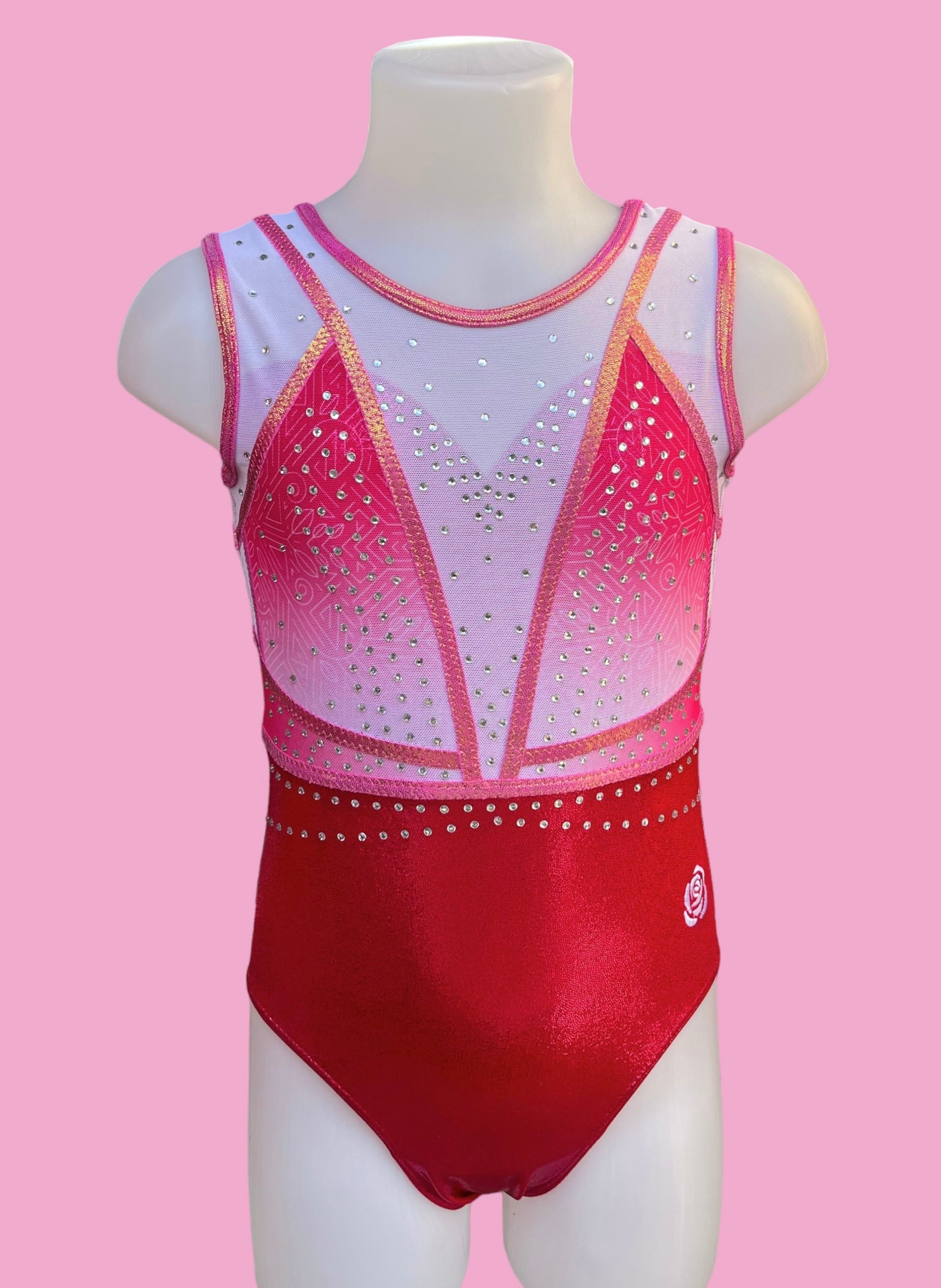 Pretty in pink, you’re sure to stand out in this striking girls gymnastics leotard. Cherry mystique with printed mesh overlay, rose gold trim and lots of clear crystal sparkle.