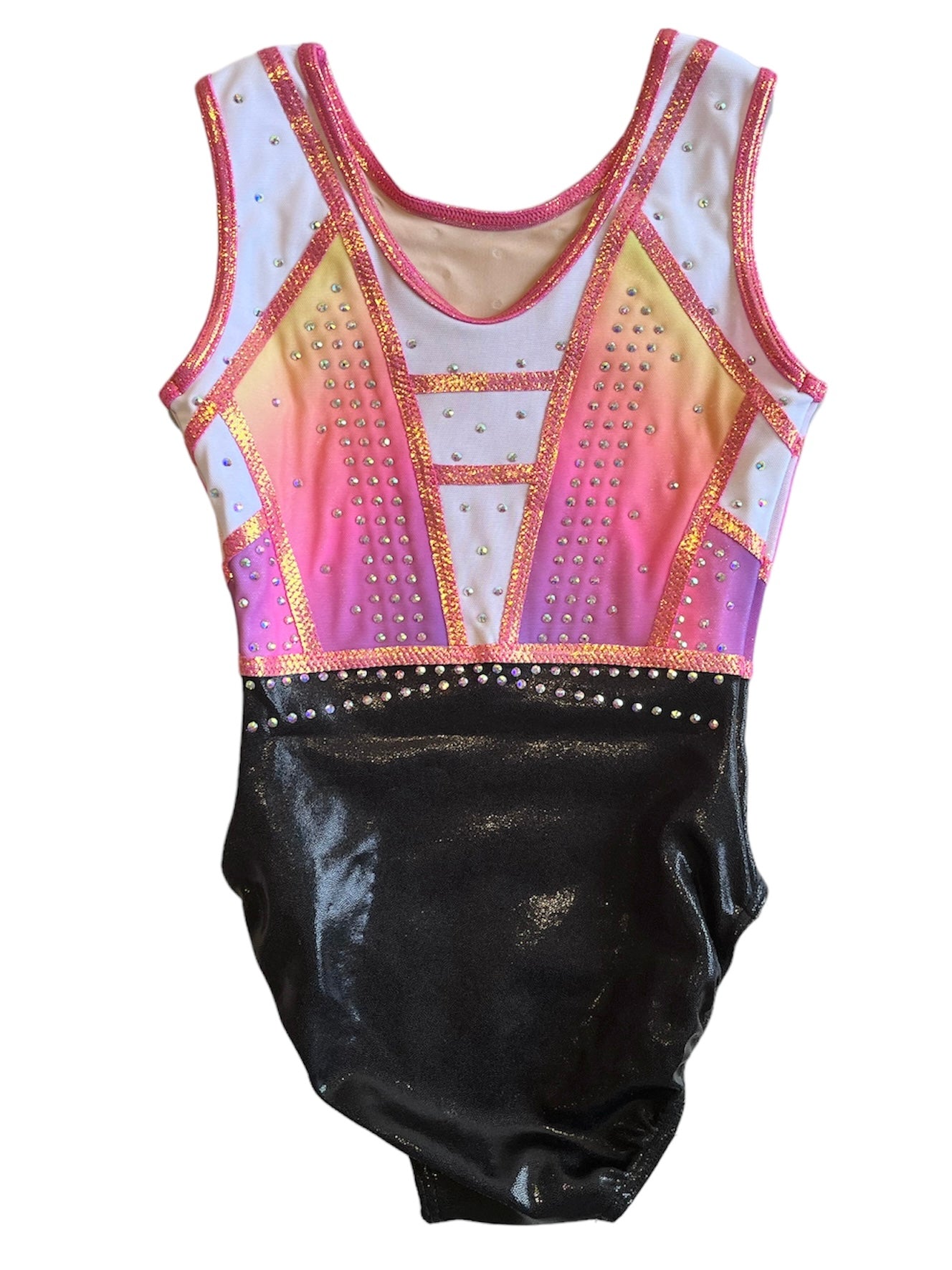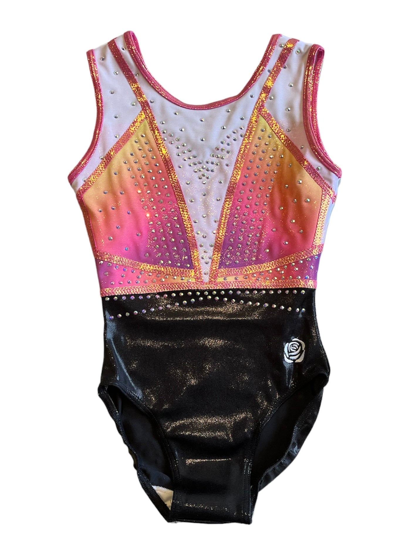 It’s golden hour all day long in Rhianna Sungold. Black mystique lower half with printed mesh upper half and rose gold mystique lining and appliqué details. Lots of pretty AB crystals to twinkle and sparkle in the lights.