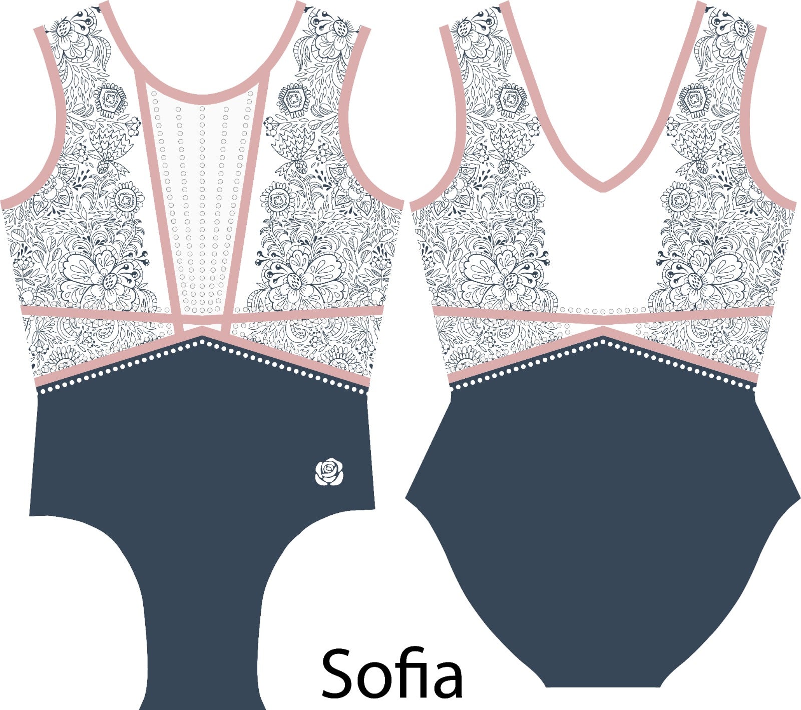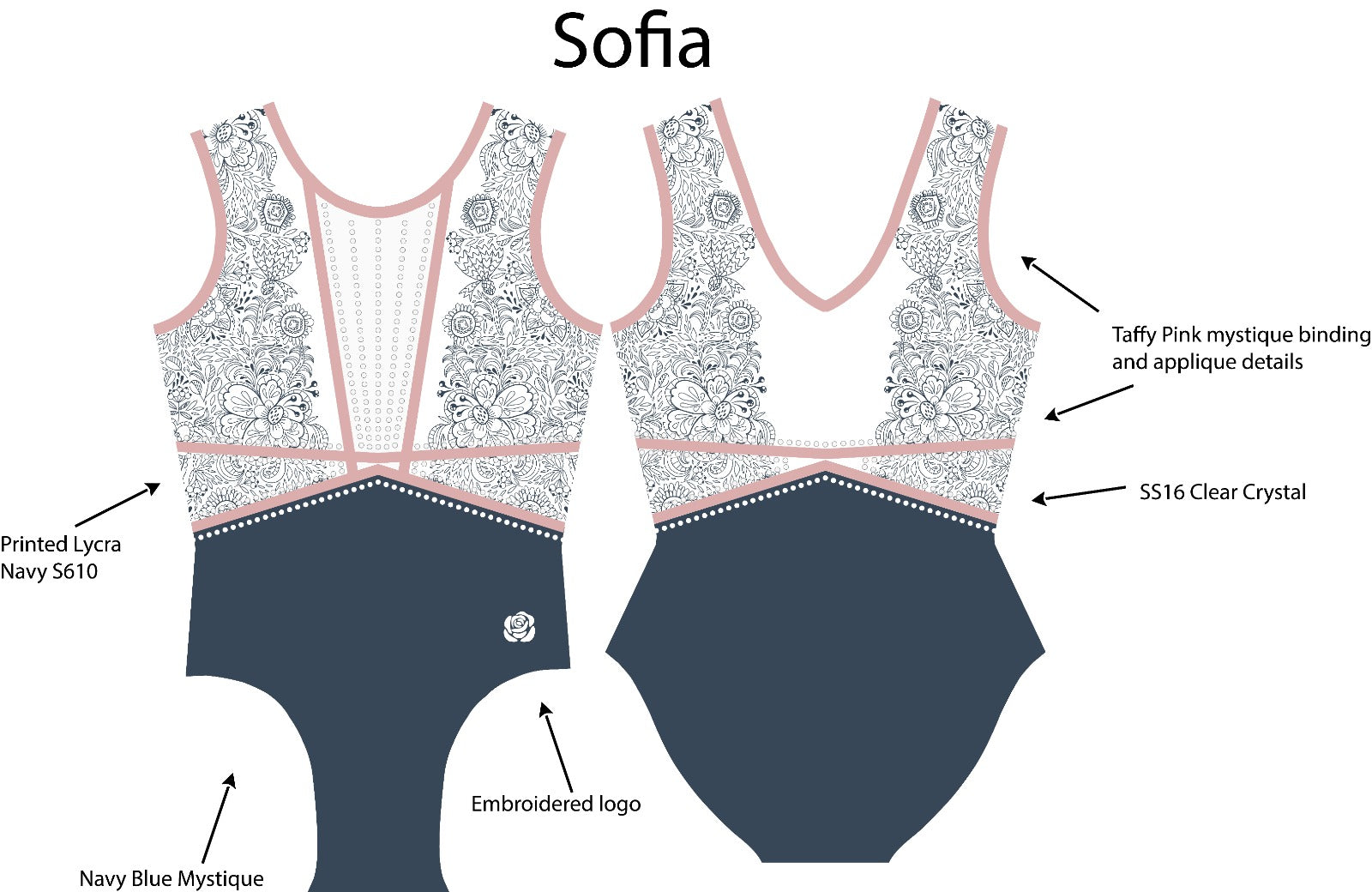 Delicate floral print on sublimated lycra with navy blue and pink mystique details.